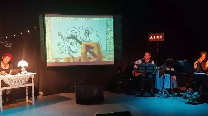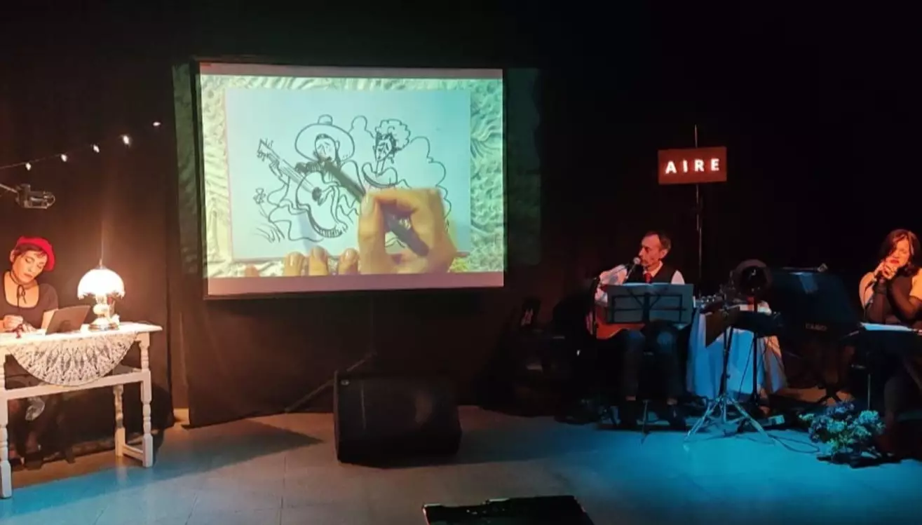 Durante la función, las canciones interpretadas en piano, guitarra y voz se entrelazan con ilustraciones.