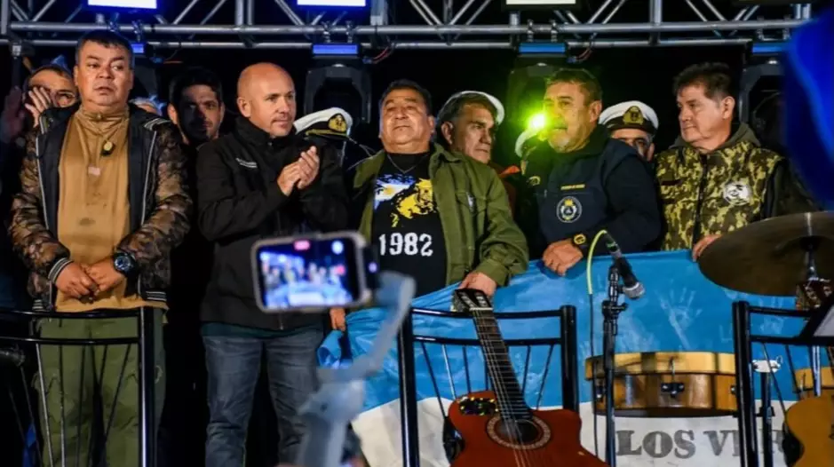Al llegar la medianoche del 2 de abril, los presentes entonaron con profunda emoción las estrofas del Himno Nacional Argentino y la Marcha de Malvinas, en un momento cargado de simbolismo.