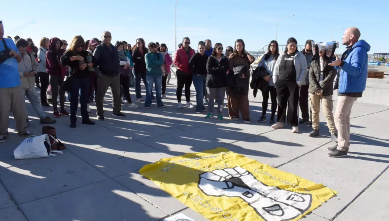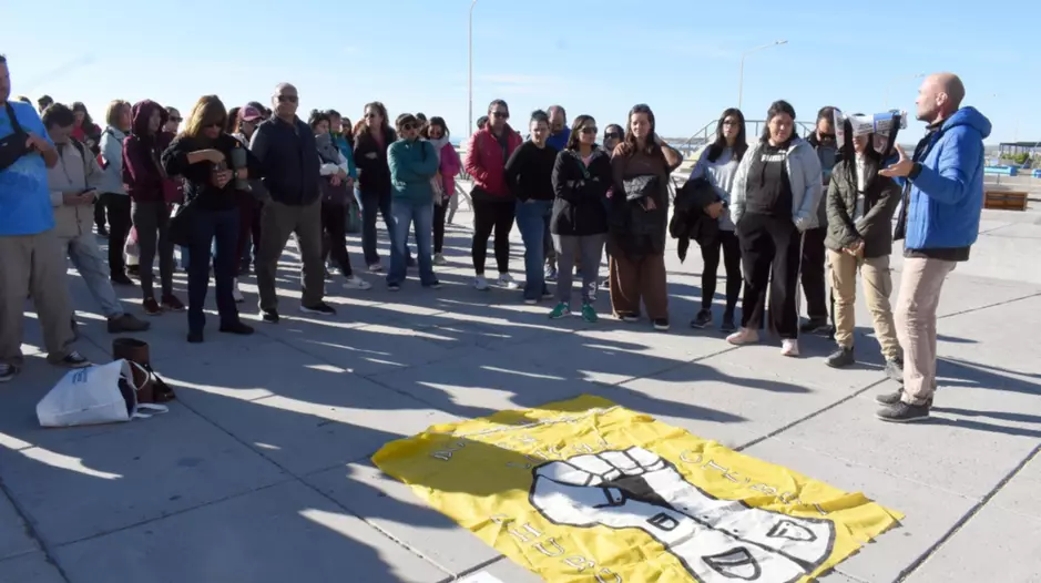 En la costanera madrynense se congregaron un nutrido grupo de trabajadores municipales de la ciudad y de Pirámides, como también provinciales, del área de salud, de educación, como a su vez trabajadores nacionales del ámbito científico (Cenpat-Conicet), entre otros organismos.
