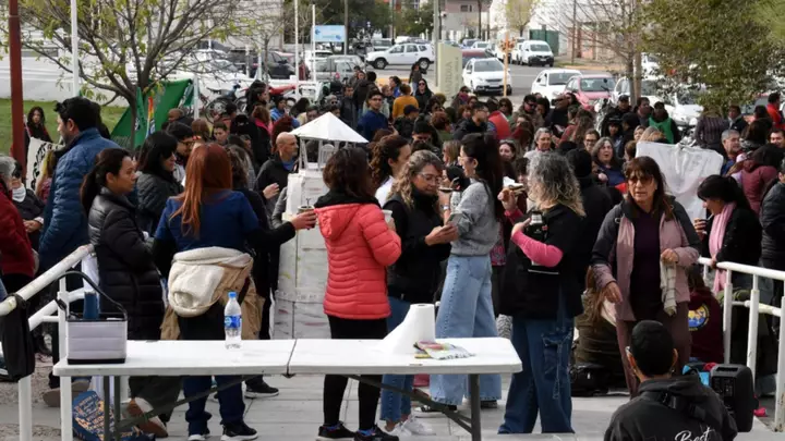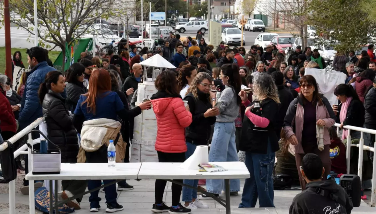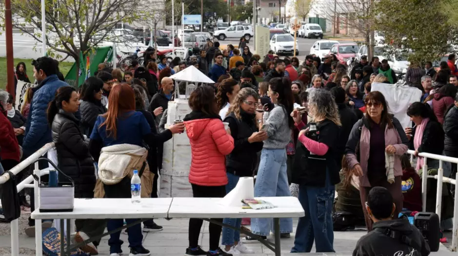 Un centenar de docentes, agremiados y no agremiados, junto a representantes sindicales de ATE seccional Puerto Madryn, Sisap, Agredmech, Atech, Judiciales, entre otros, se hicieron presentes en la vereda del nosocomio, mientras se cocinaba en una olla popular que se compartió con todos los presentes pasado el mediodía. Se pudo observar gran cantidad de banderas y carteles alusivos desplegados en las barandas de la escalinata, en las columnas y ventanales del hospital, haciendo expresa referencia a la recomposición salarial que vienen solicitando al gobierno provincial y la apertura de mesas paritarias.