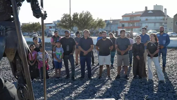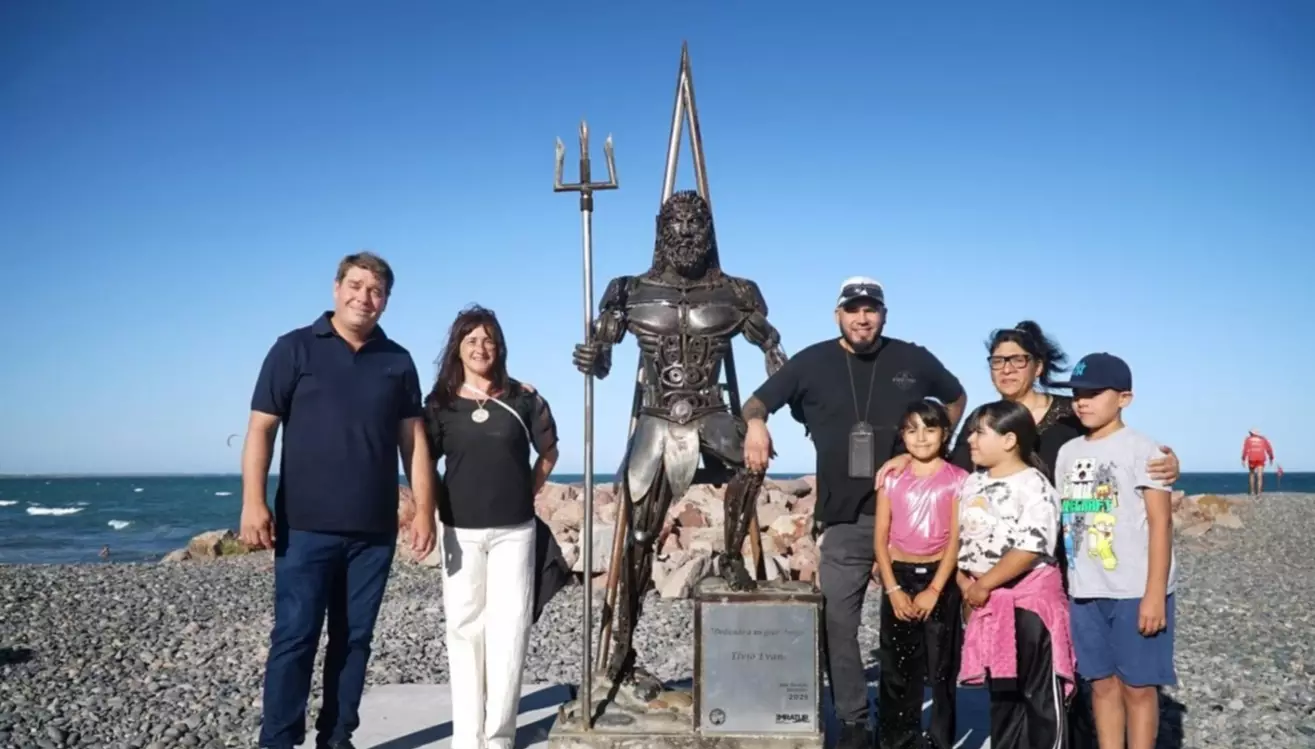 El intendente de Rawson, Damián Biss, encabezó ayer junto a su gabinete el descubrimiento de la escultura de «Poseidón», creada por un vecino de la ciudad Damián González.