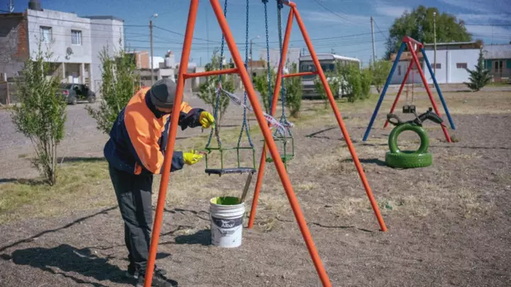 La intervención contó con la colaboración de la Secretaría de Ambiente, que realizó la limpieza general del predio, y del presidente de la vecinal Gregorio Mayo, Néstor Ranileo, quien gestionó la donación de juegos confeccionados a partir de cubiertas de vehículos, sumando creatividad y color al espacio. Desde el Corralón Municipal se instalaron bancos de hormigón que completan el equipamiento renovado.