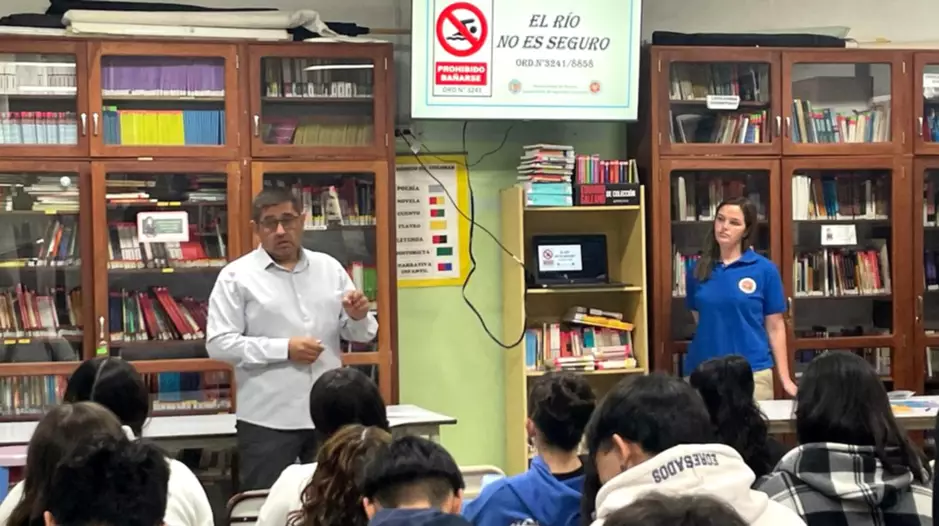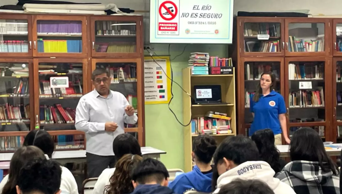 Esta mañana, el subsecretario de Seguridad Ciudadana, Juan Emilio Villagrán, junto a personal y autoridades de Protección Civil, visitaron la Escuela Provincial N° 729 “Dr. Salvador Mazza”, donde mantuvieron un encuentro con los estudiantes del último año de secundaria. La actividad incluyó una charla informativa sobre los riesgos del río y la importancia de respetar la Ordenanza N° 3241, que prohíbe el uso del Río Chubut como balneario entre el inicio del Parque Recreativo General San Martín y la desembocadura en Puerto Rawson.