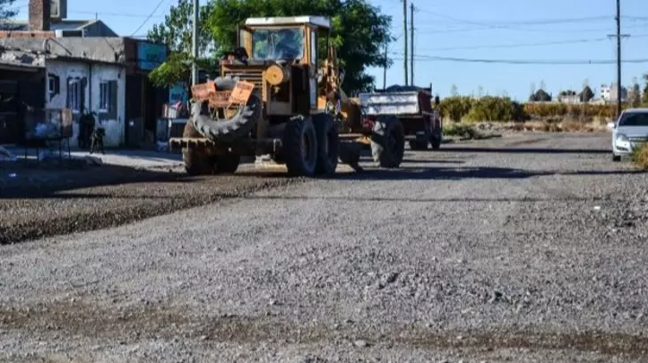 Las cuadrillas de la Secretaría de Obras y Servicios Públicos avanzan en la reparación y reacondicionamiento, utilizando material de relleno para consolidar las calles. Además, se movilizó el camión regador y la motoniveladora para intensificar el trabajo en el barrio.