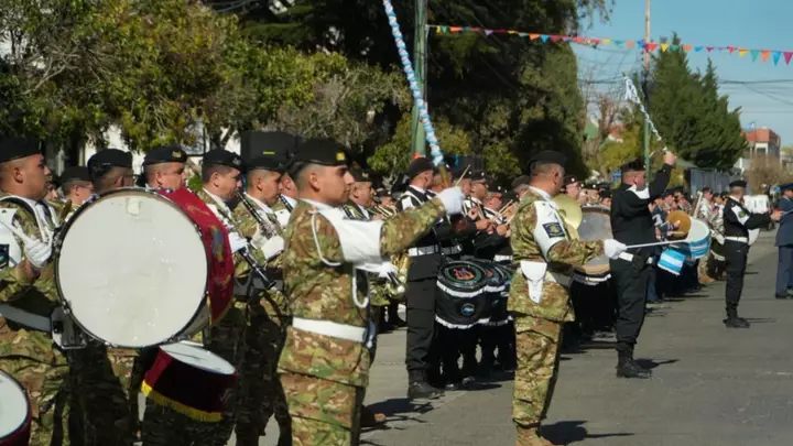 El desfile estuvo acompañado por destacadas bandas militares y policiales, que abrieron y cerraron los distintos bloques del recorrido. Entre ellas se destacaron la Banda de Música de la Fuerza Aérea “Capitán Luis Candelaria” de Comodoro Rivadavia, la Banda Militar “Malvinas Argentinas” del RC Expl 3 de Esquel, la Banda Militar “Combate de San Carlos” del RIMec 25 de Sarmiento y la Banda de la Policía del Chubut, bajo la dirección de Darío Quintraman. La formación musical comenzó con la Banda de Esquel y culminó con la Banda local, interpretando el Himno Nacional y la Marcha de Malvinas, reafirmando el compromiso y la identidad colectiva.