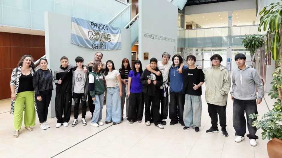 Estudiantes de 3° año de la escuela Nº 7.705 de Rawson acompañados por sus profesores María Rolon, de Construcción de la Ciudadanía; Laura González, de Historia; y Juan Cortez, de Geografía, visitaron la Legislatura.