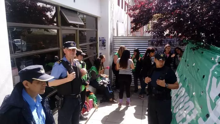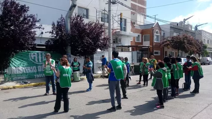 Auxiliares de la Educación se manifiestan frente a la Supervisión de Educación en Trelew en reclamo del pase a planta de trabajadores.