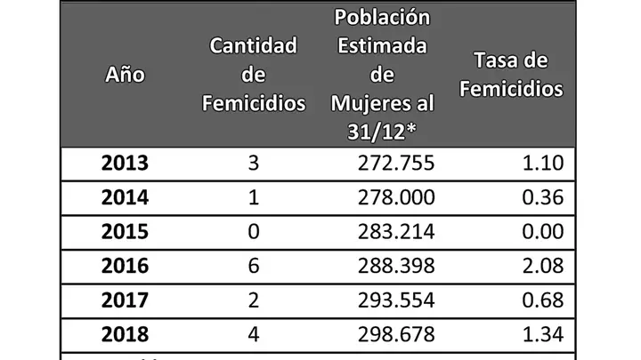 «Dicha información sigue el protocolo de trabajo del Registro Nacional de Femicidios de la Justicia Argentina.  En el año 2018, se registraron 278 víctimas de femicidios en el país, arrojando una tasa de femicidios de cada 100 mil mujeres de 1,1», indicó el informe.