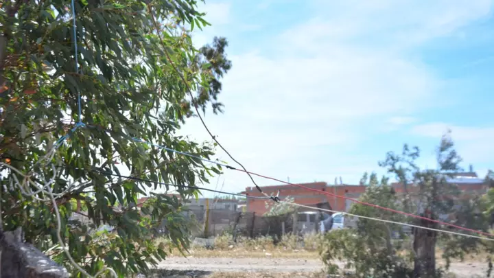 Las conexiones ilegales que llevan la energía eléctrica desde el Moreira IV al nuevo barrio del Intaa, al oeste de Trelew, sucumbieron sobre la vía pública bloqueando el paso de vehículos y provocando un riesgo eléctrico inminente que podría costarle la vida a cualquier vecino que se acerque.