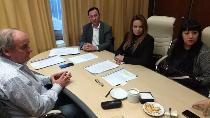 El intendente Adrián Maderna, acompañado por la concejal electa Lorena Alcalá, y la titular del Area de la Mujer, Priscila Llancafil, se reunió ayer en Rawson con el titular del IPV, Carlos Simionati, y la gerenta del organismo, Ivana Papaiani, para observar los módulos que se emplearán, de manera provisoria, para albergar mujeres víctimas de violencia de género.