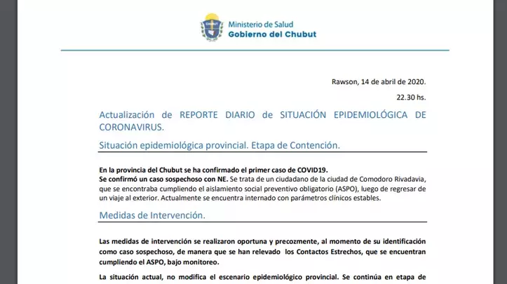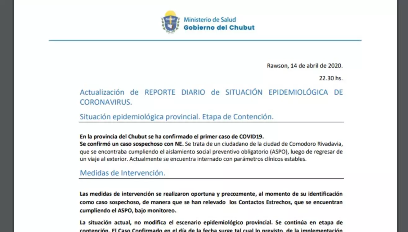 Se trata de un ciudadano de la ciudad de Comodoro Rivadavia, que se encontraba cumpliendo el aislamiento social preventivo obligatorio (ASPO), luego de regresar de un viaje al exterior. Actualmente se encuentra internado con parámetros clínicos estables.
