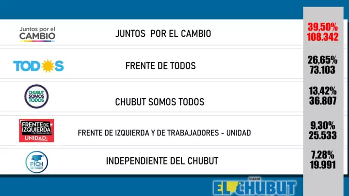 Frente de Todos fue 2° con el 26,65% de los votos; Chubut Primero se ubica en 3° con 13,42%; el Frente de Izquierda 4° con el 9,30%. Por último, el PICH se encuentra último con el 7,28%. El martes comienza el escrutinio definitorio