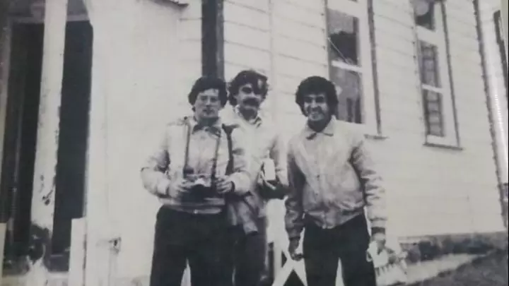 Como suele ocurrir a los fotógrafos, solo hay una sola foto suya en Malvinas: una imagen donde posan los tres en la puerta de la iglesia de Malvinas.