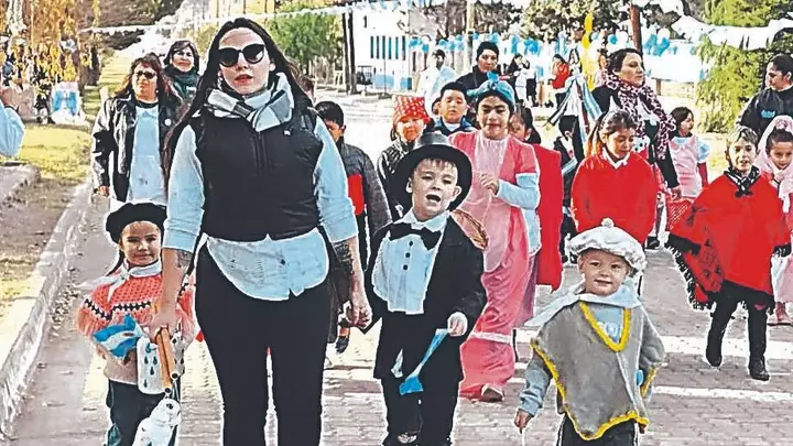 Toda la comunidad de Las Plumas participó ayer del desfile en conmemoración de un nuevo aniversario de la Revolución de Mayo, el cual fue organizado por la Escuela 77 de dicha localidad y la Comuna Rural.