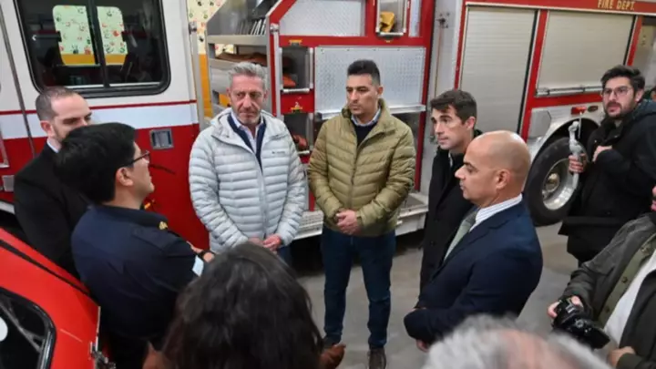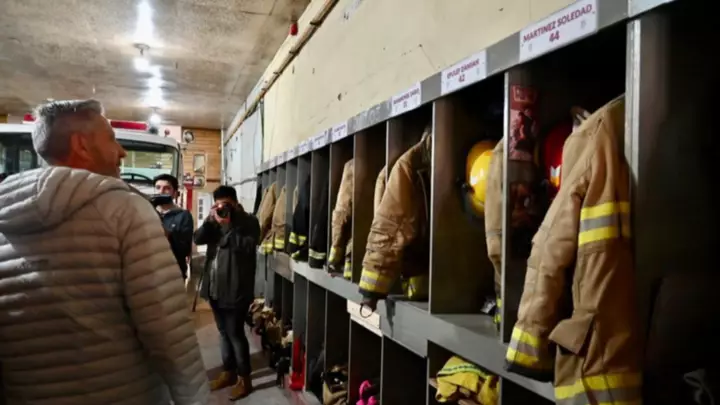 Seguidamente, Arcioni fue recibido por el jefe del Cuartel de Bomberos, Gustavo Jaramillo, el presidente de la Asociación de Bomberos Voluntarios, Miguel Ávila, como así también representando a la empresa PAE, Juan Taccari, junto a miembros del cuartel, a quienes les entregó dos equipos autónomos. Se trata de dos Trajes Completos (Monjita, capucha, casco, guantes y botas)