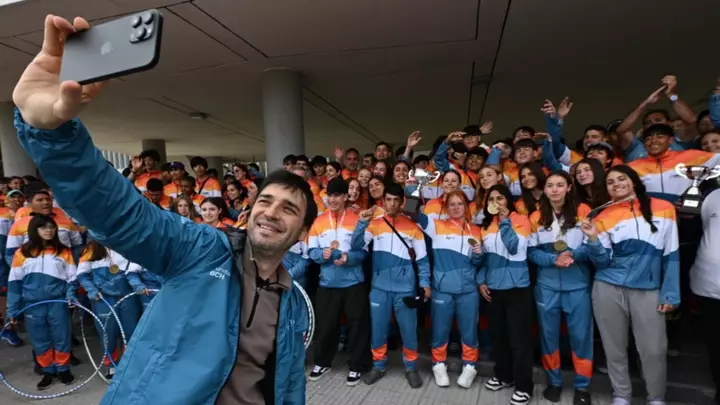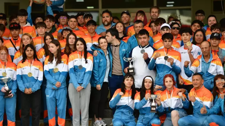 El gobernador Ignacio «Nacho» Torres recibió ayer, en la explanada de la Legislatura a la delegación de más 350 jóvenes deportistas de la provincia, que regresó este domingo de los Juegos Deportivos Nacionales Evita, que se desarrollaron del 5 al 9 de noviembre en Mar del Plata.