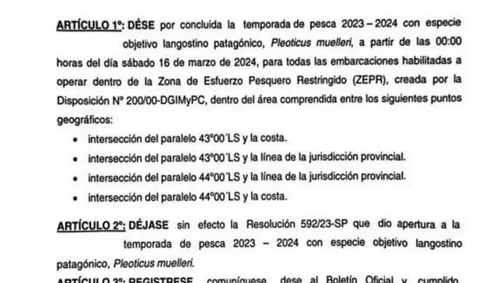 A través de una resolución, la Secretaría de Pesca provincial dio por «concluida la temporada de pesca 2023-2024 con especie objetivo langostino patagónico, Pleoticus muelleri, a partir de las 0 horas del sábado 16 de marzo de 2024, para todas las embarcaciones habilitadas a operar dentro de la Zona de Esfuerzo Pesquero Restringido, creada por la Disposición Nº200/00DGIMyPC». La disposición fue publicada en el Boletín Oficial provincial.