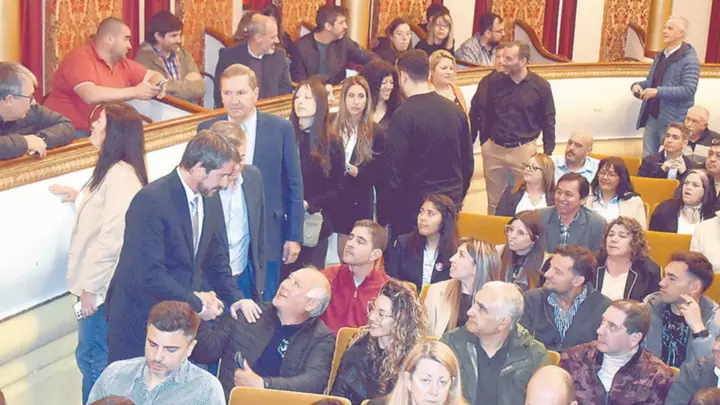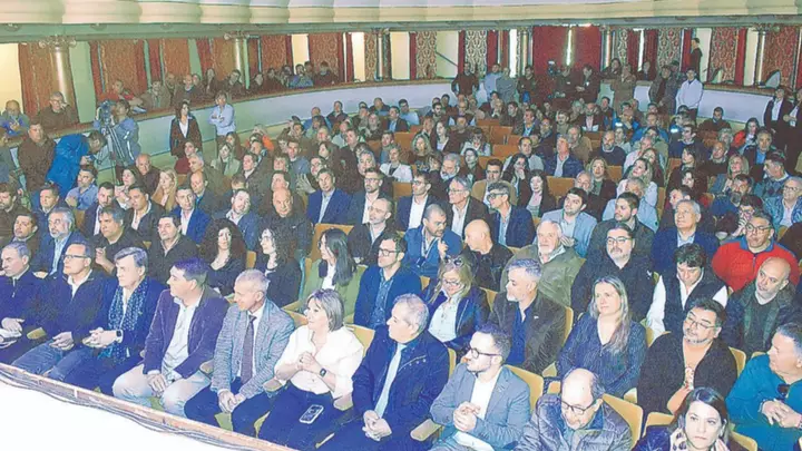 Ante un concurrido Teatro Español, Merino recordó que «a lo largo de la historia se formaron islas productivas. Un Parque Industrial que con beneficios y servicios se puso a disposición del privado, un aeropuerto que se ideó no solo para el transporte de pasajeros, sino de carga, un valle productivo que año a año fue aumentando su producción y una de las últimas construcciones que se plasmaron producto de políticas a largo plazo: un Mercado Concentrador para tratar productos regionales».