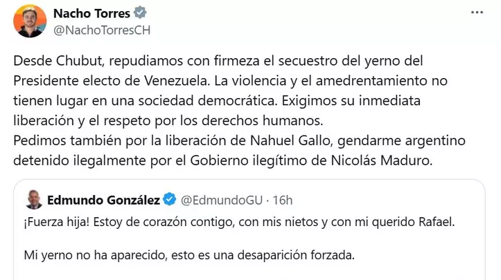 En su posteo, el mandatario chubutense expresó: «Desde Chubut, repudiamos con firmeza el secuestro del yerno del presidente electo de Venezuela. La violencia y el amedrentamiento no tienen lugar en una sociedad democrática. Exigimos su inmediata liberación y el respeto por los derechos humanos».