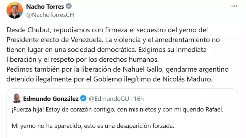 El gobernador de Chubut, Ignacio «Nacho» Torres, manifestó su enérgico repudio al secuestro de Rafael Tudares, yerno de Edmundo González Urrutia, presidente electo de Venezuela, en un mensaje difundido a través de la red social X. Además, por la misma vía, exigió la liberación del gendarme argentino Nahuel Gallo, detenido en ese país, y reafirmó su compromiso con la defensa de los derechos humanos y la democracia en la región.