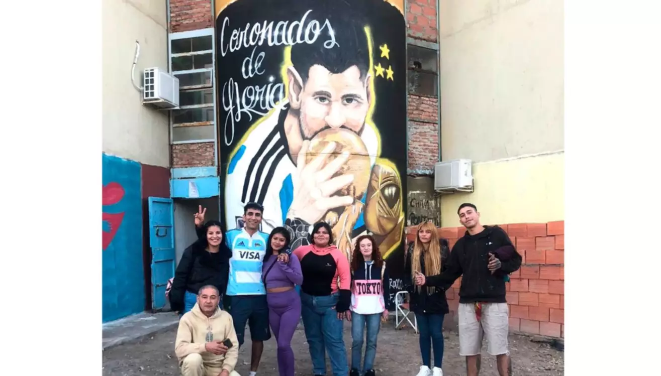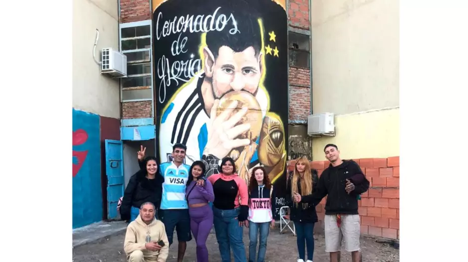 El pasado jueves se presentó oficialmente una obra de arte urbano en el barrio Constitución, más conocido como Las Mil Viviendas, a la altura de la Escalera Nø 38, Sector B, que retrata a Lionel Messi con la Copa del Mundo, «Coronados de Gloria».