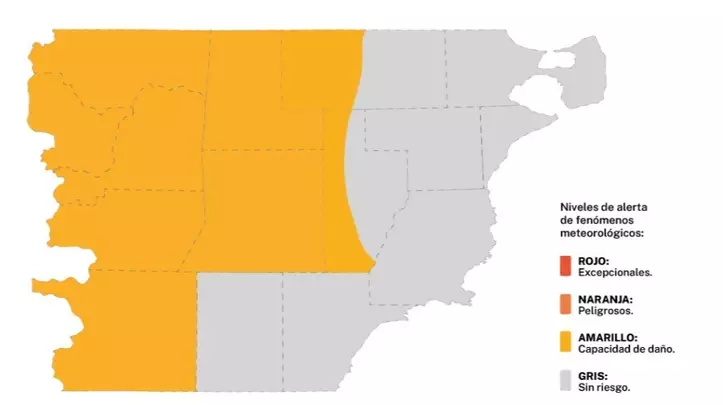 Las áreas afectadas se verán alcanzadas por vientos fuertes del sector oeste, con velocidades estimadas entre 40 y 60 km/h, y ráfagas que podrían superar los 90 km/h.