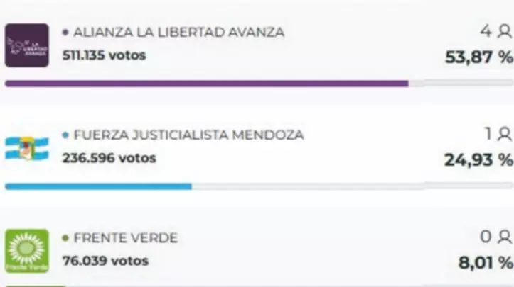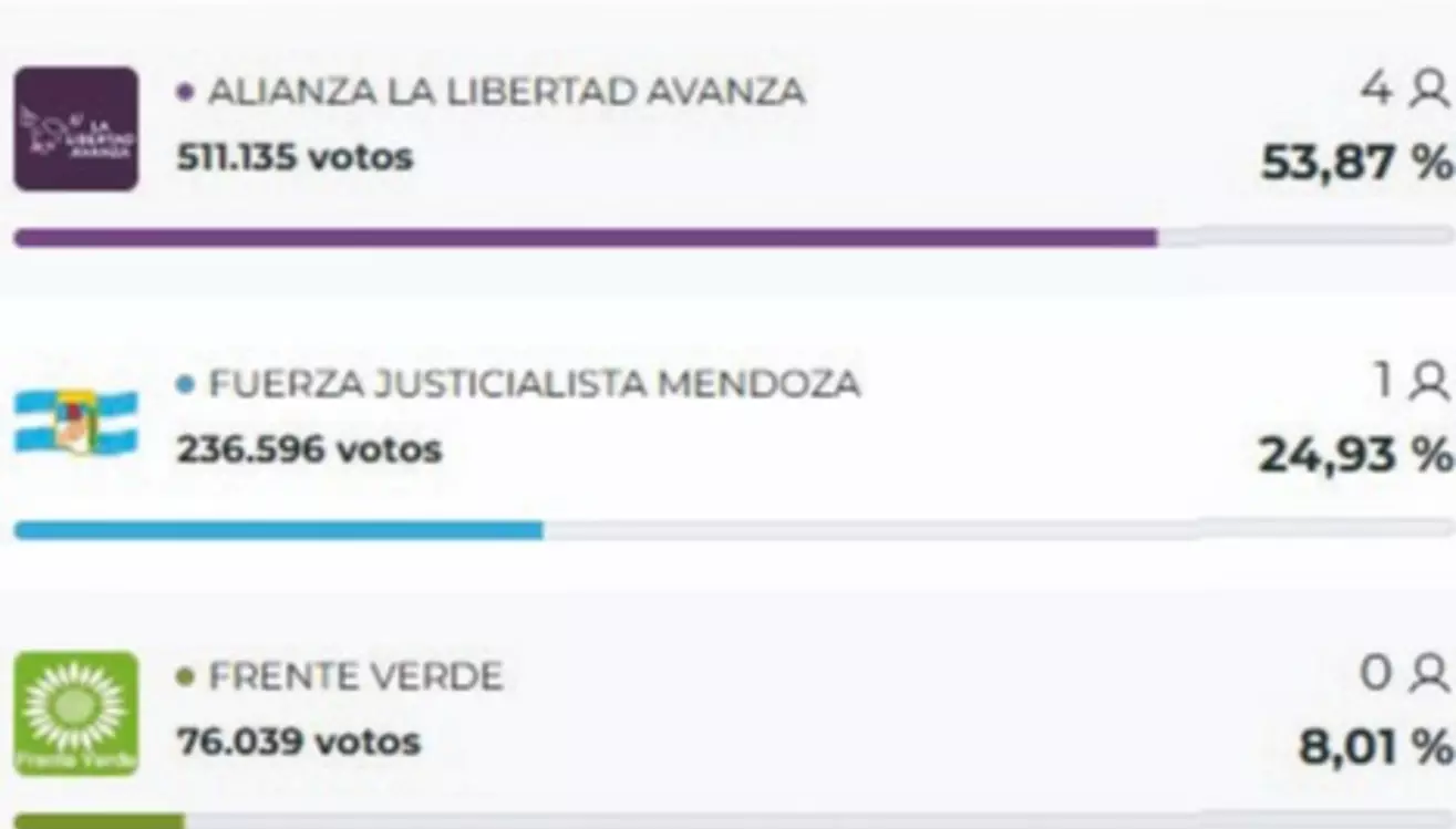 Con el ministro de Defensa Luis Petri a la Cabeza, la alianza La Libertad Avanza-Cambia Mendoza se imponía por el doble contra el espacio Fuerza Justicialista encabezado por Emir Félix, con 53,72% contra 25,3%, respectivamente.