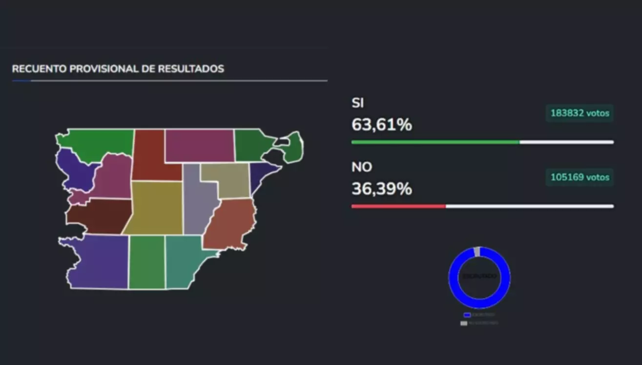 La reforma constitucional para eliminar los fueros en Chubut fue aprobada por una amplia mayoría y entrará en vigencia sin necesidad de una nueva instancia legislativa. Con el 97% de las mesas escrutadas, el “Sí” obtuvo el 63,61% de los votos (183.832 sufragios), frente al 36,39% del “No” (105.169 votos).
