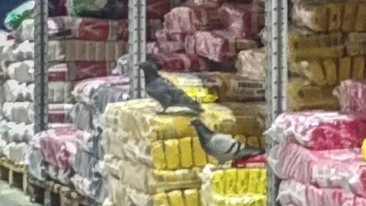 Sorprende la presencia de palomas entre la mercadería de un mayorista
