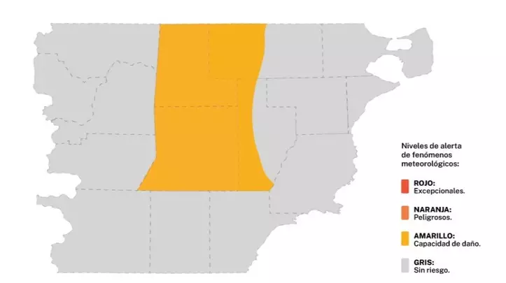 El organismo indicó que los fenómenos podrían estar acompañados por actividad eléctrica frecuente, ráfagas de hasta 60 km/h, ocasional caída de granizo y abundante caída de agua en cortos períodos. Se esperan valores de precipitación acumulada entre 10 y 30 milímetros.