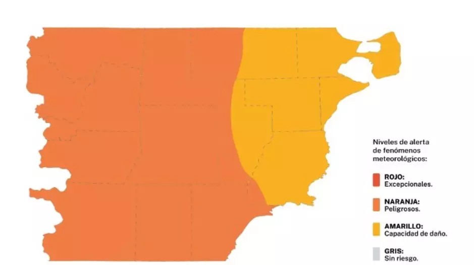 En las zonas amarillas, durante la mañana - tarde, se esperan vientos del sector oeste con velocidades entre 40 y 60 km/h, con ráfagas que podrán superar los 90 km/h.