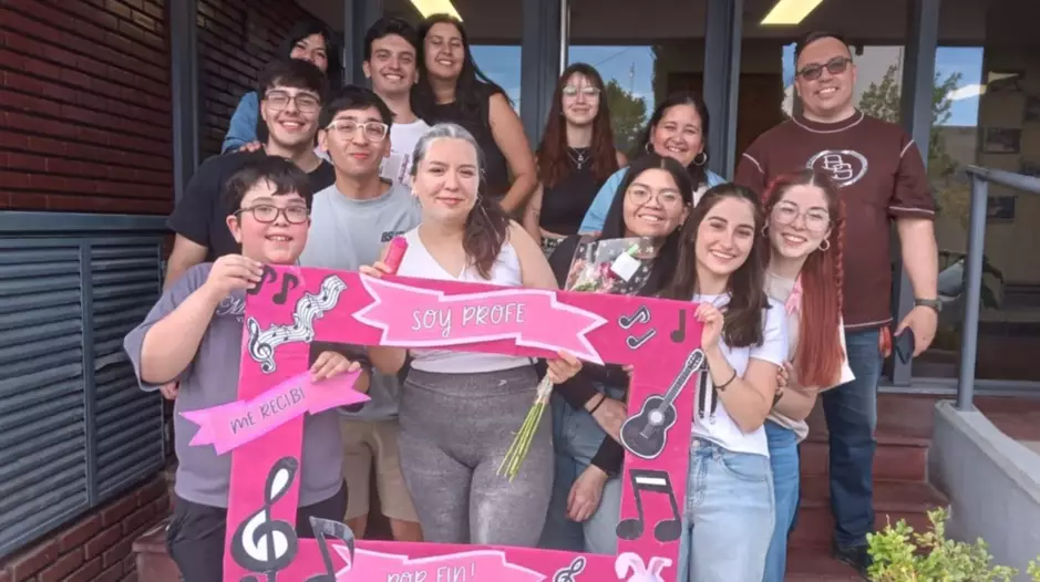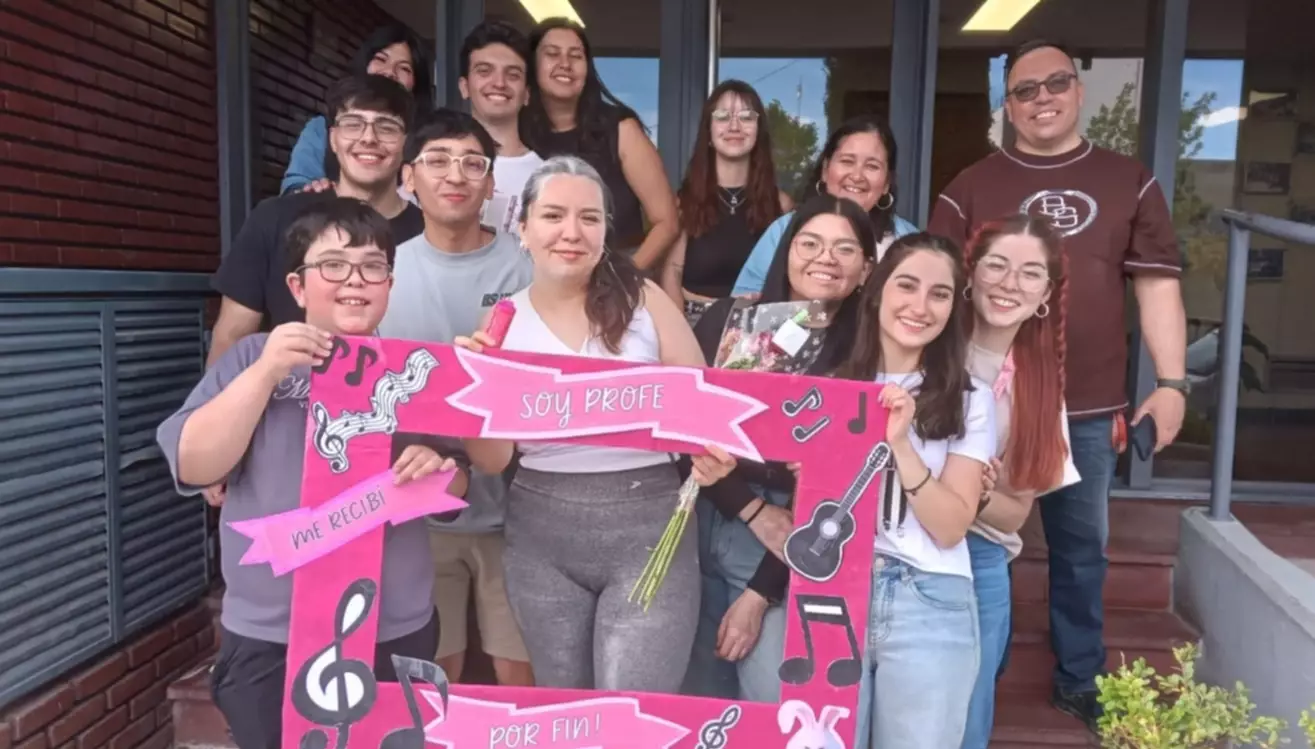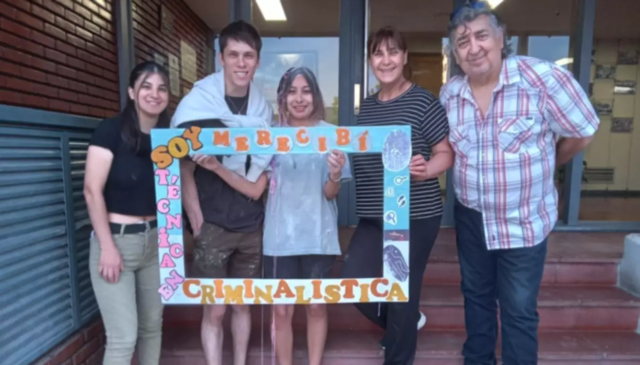Su última materia para lograr su título, fue «Práctica Profesional». Sus estudios primarios los cursó en la Escuela 182 «Edwin Roberts» y secundario en el Colegio 762 «Dr. René Favaloro», ambos establecimientos de Trelew. Acompañado por su novio Juan Manuel y sus futuros suegros, con quienes festejó por este logro y posaron para la posteridad.