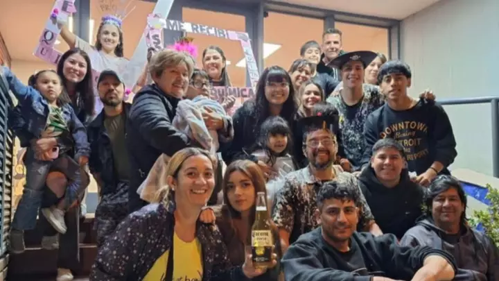 Con una inmensa alegría y rodeado de familiares, Ayelén Lago, Edith Ruiz, Mauro Casanova y Federico Suarez festejaron en las puertas de EL CHUBUT su título terciario.