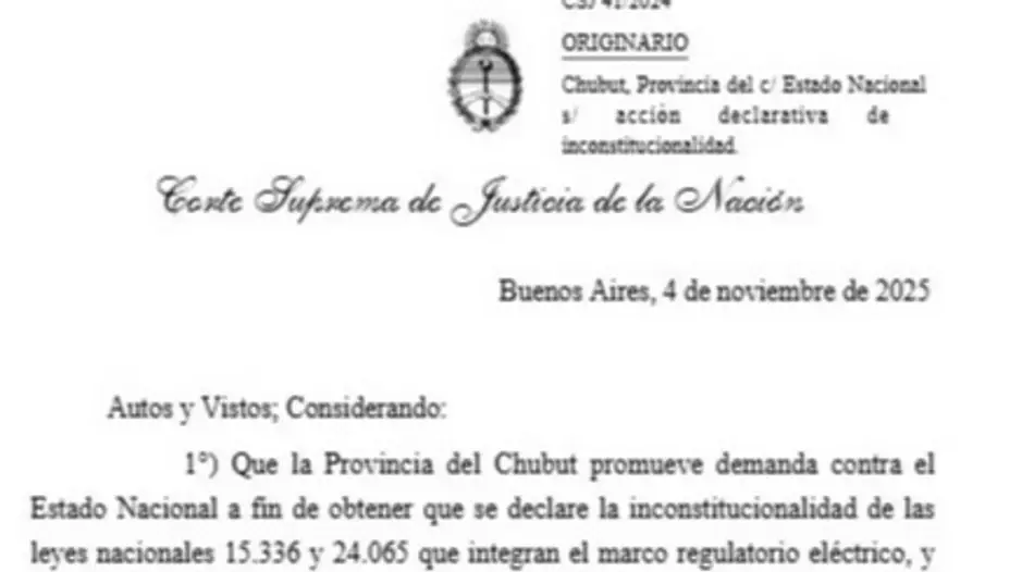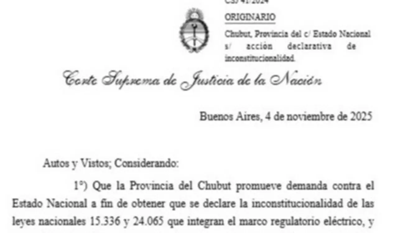 La Corte Suprema de Justicia dio curso a una demanda presentada por la provincia de Chubut contra el Estado Nacional, en la que se cuestiona la validez de dos leyes del marco regulatorio eléctrico que, según la administración provincial, vulneran su dominio sobre los recursos naturales y afecta a la central hidroeléctrica Futaleufú.