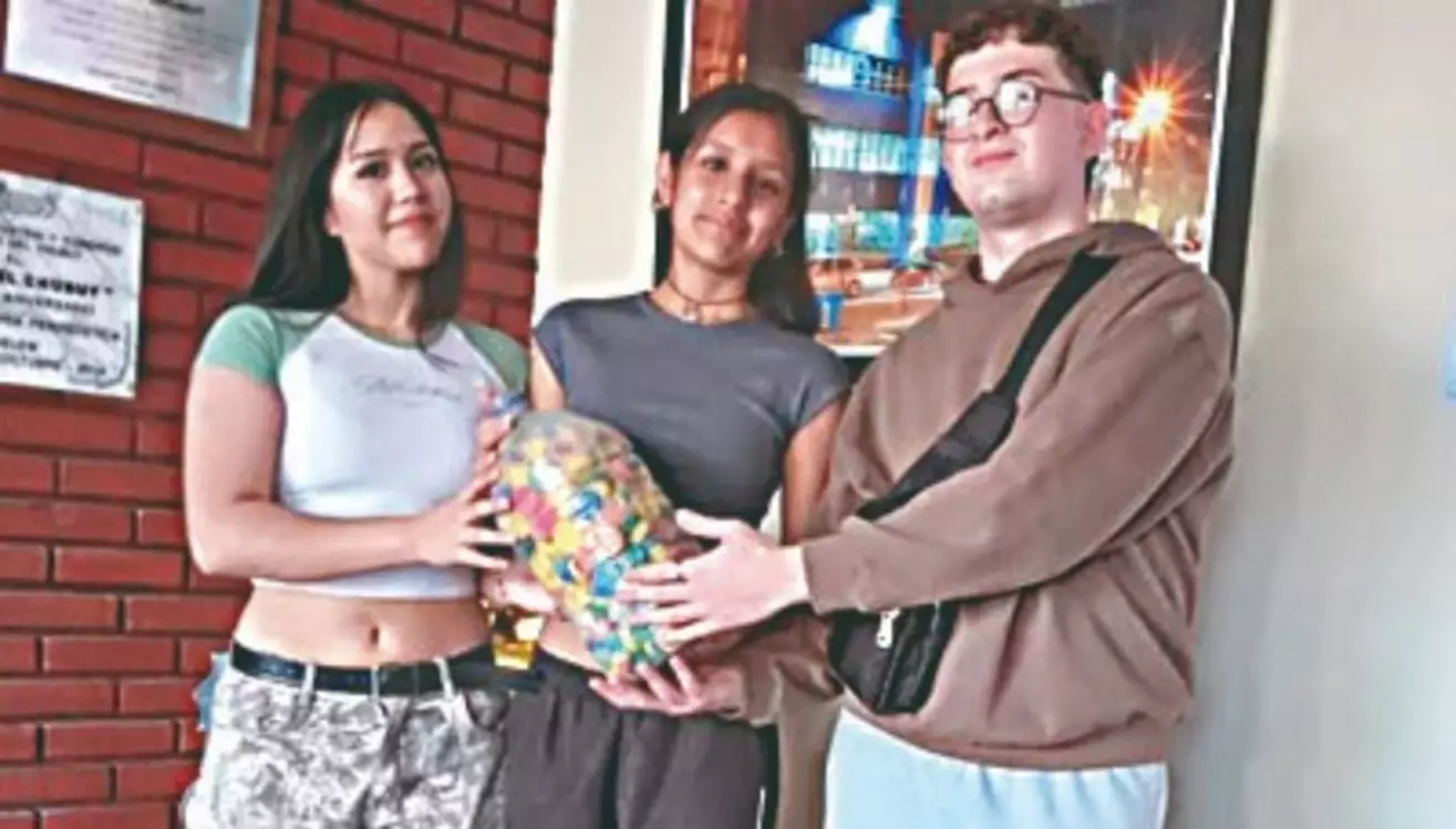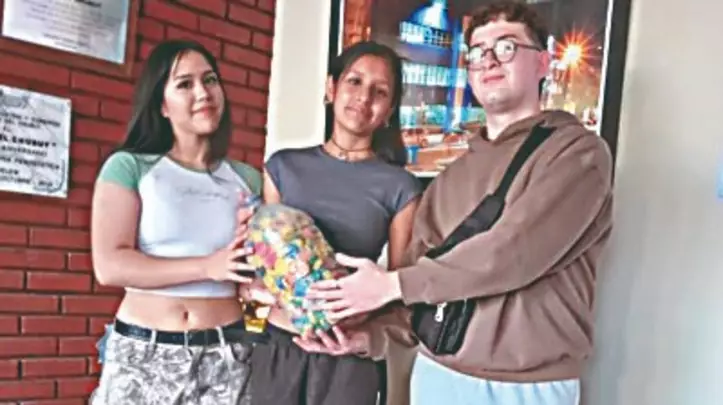 Los alumnos del ex Comercial 1 de Trelew, Carolina Cancia, Ornella Rojas y Mateo Osorio, trajeron a EL CHUBUT tapitas para el programa de Reciclaje del Hospital de Niños Garrahan de Capital Federal.