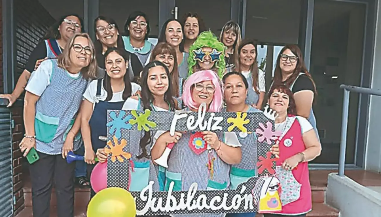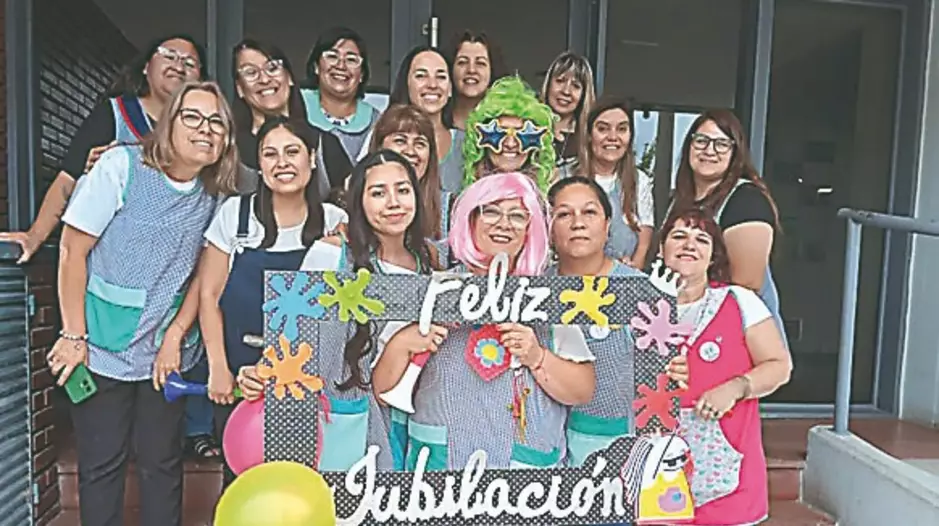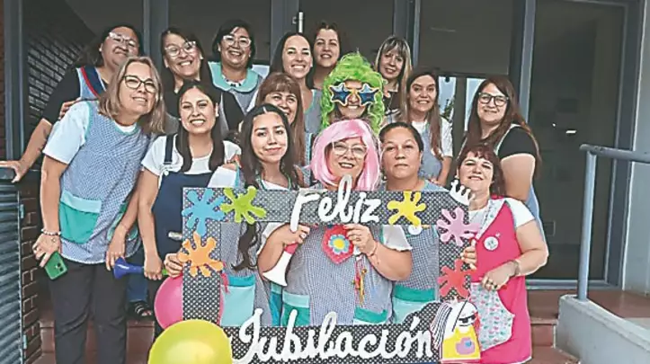 Rodeada de sus compañeras de trabajo, Paola Arca Basbous se jubiló luego de 25 años de trabajar como maestra jardinera, en la Escuela de Nivel Inicial 442 del barrio Corradi de Trelew.