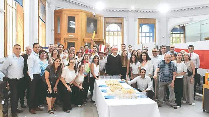 José Luis y Onubio, empleados de la sucursal Trelew del Banco Nación, cumplieron ayer con su último día laboral y fueron despedidos como es una tradición en esta entidad; se les efectuó un pasillo de honor antes de salir por la puerta por última vez. Se compartió una torta y delicias varias.