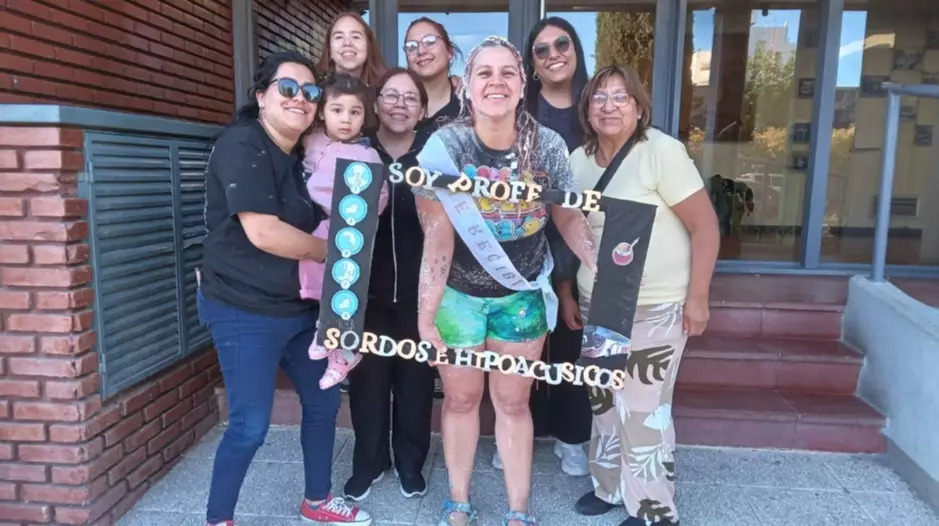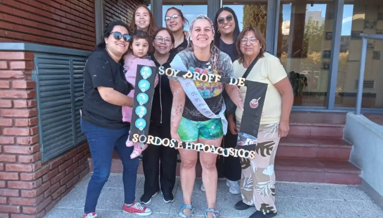 Para expresar su alegría al finalizar la carrera y recibirse como Profesora de Sordos e Hipoacúsicos, Tania Barrientos vino junto a sus familiares y amigas a festejar el logro de viajar diariamente de Puerto Madryn al Instituto Superior de Formación Docentes (ISFD) 801 «Juana Manso» de Trelew.