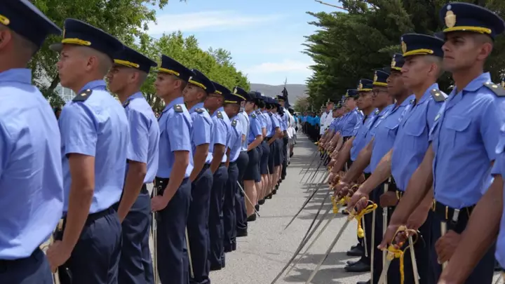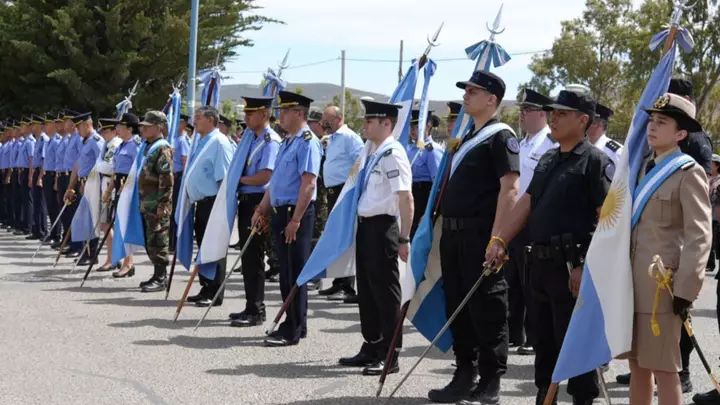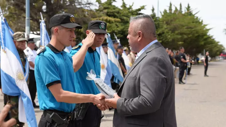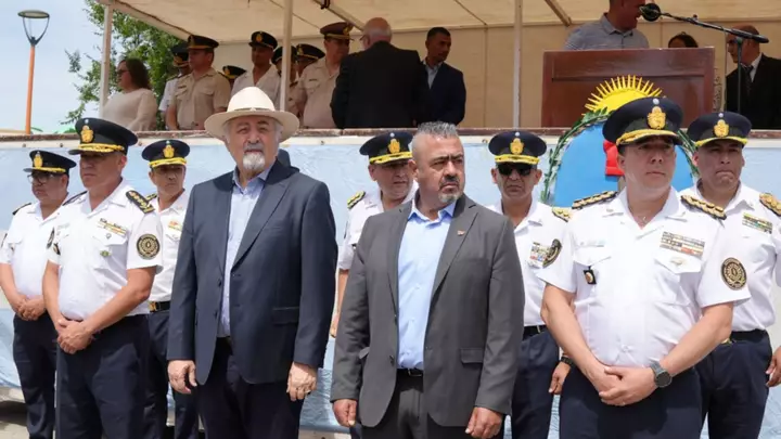 En representación del gobernador Ignacio Torres, el ministro de Seguridad y Justicia, Héctor Iturrioz; junto al jefe de la Policía del Chubut, Andrés García; y el subjefe de la fuerza, Mauricio Zabala, encabezaron ayer el acto por el 68ø aniversario de la Policía en Comodoro Rivadavia.