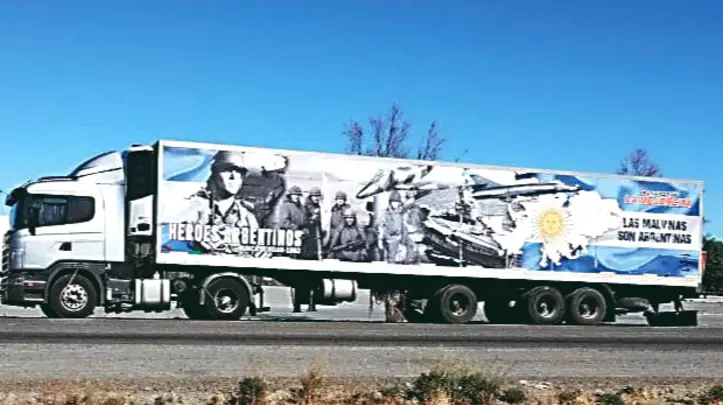 Un camión de transporte que circulaba por la Ruta 3 con destino al sur, y al pasar por Trelew, llamó la atención por el enorme ploteo en su carrocería, rindiendo homenaje a la gesta de Malvinas, donde aparecen soldados que combatieron, bajo el rótulo «Héroes Argentinos» y la escena muestra a nuestros soldados prestos a luchar, también la escena del hundimiento de uno de los barcos insignia del Reino Unido, mientras surcan el cielo aviones que hicieron posible esa hazaña. En este gigantesco mural aparecen las Islas Malvinas con la frase que las reivindica «Las Malvinas son Argentinas». La empresa de transportes es «La Mejorcita» que tiene su camión ploteado en homenaje a los chicos que fueron a combatir, muchos quedaron en las Islas y los que volvieron son testigos del decidido intento por recuperarlas.