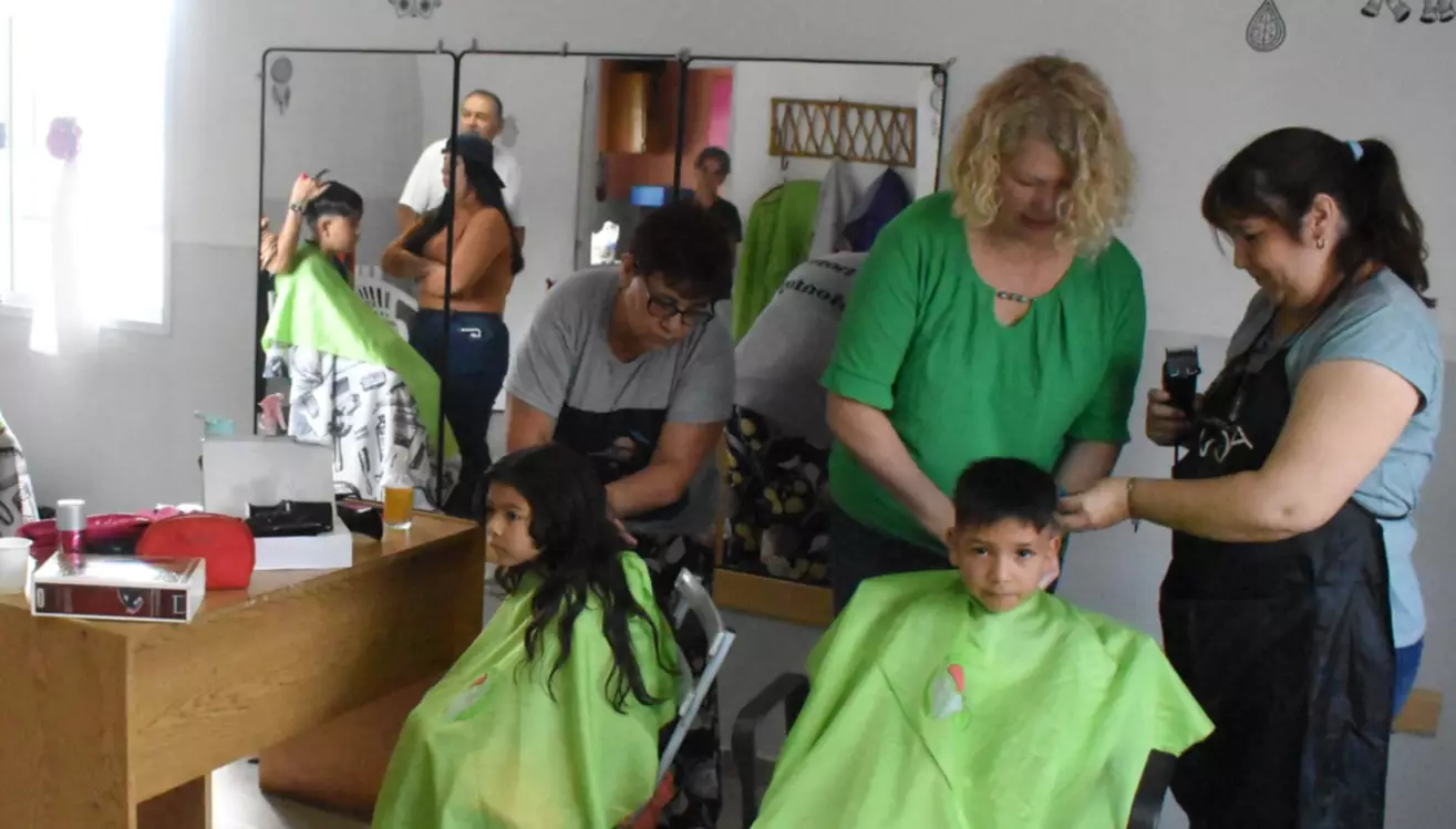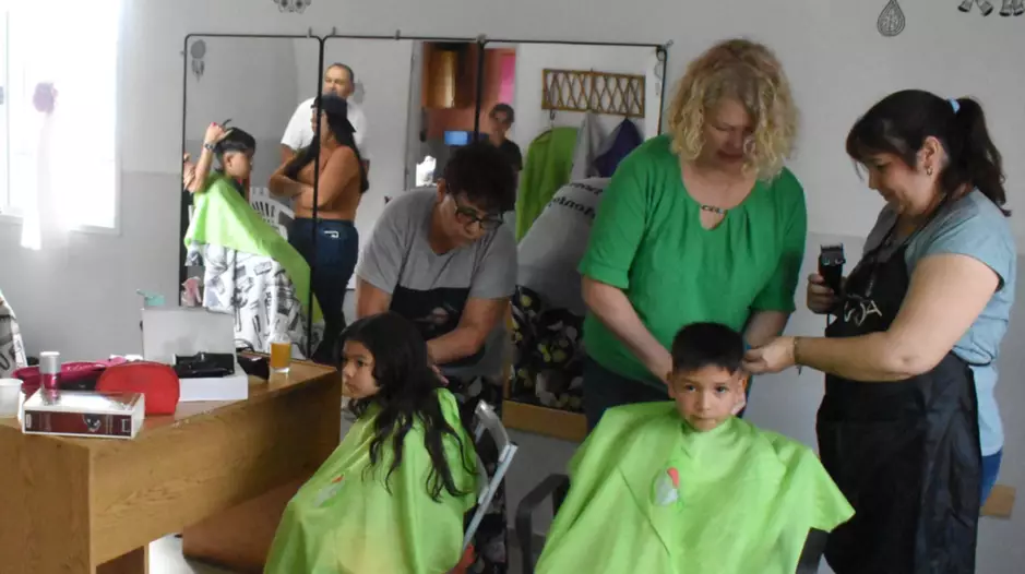 Más de 20 pibes en edad escolar primaria fueron atendidos este viernes por la mañana por un grupo de peluqueras solidarias, en la vecinal del barrio Los Aromos de Trelew.