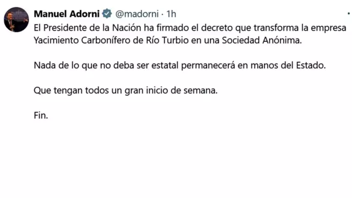 «El Presidente de la Nación ha firmado el decreto que transforma la empresa Yacimiento Carbonífero de Río Turbio en una Sociedad Anónima. Nada de lo que no deba ser estatal permanecerá en manos del Estado. Que tengan todos un gran inicio de semana. Fin», anunció Manuel Adorni.