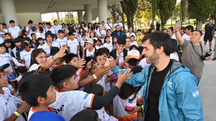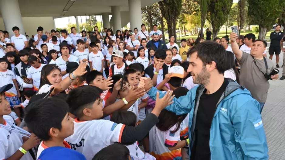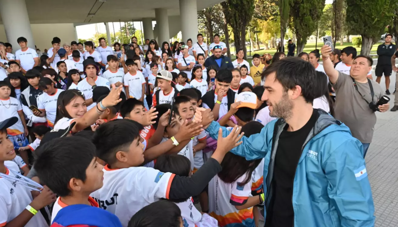 Los Juegos Comunales que reunieron a unos 620 chicos de 8 a 14 años fueron una gran iniciativa del Gobierno, con el apoyo de la Fundación Banco del Chubut que preside Ornella Costa, y de Pan American Energy. En la imagen, aparece Nacho Torres recibiendo a los pequeños deportistas. «Estos juegos sirven para integrar a chicos de toda la provincia», dijo el Gobernador.