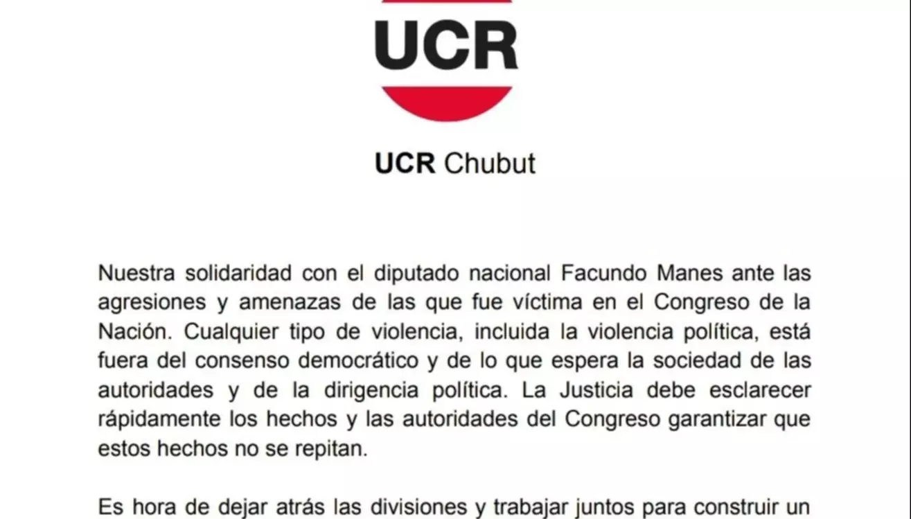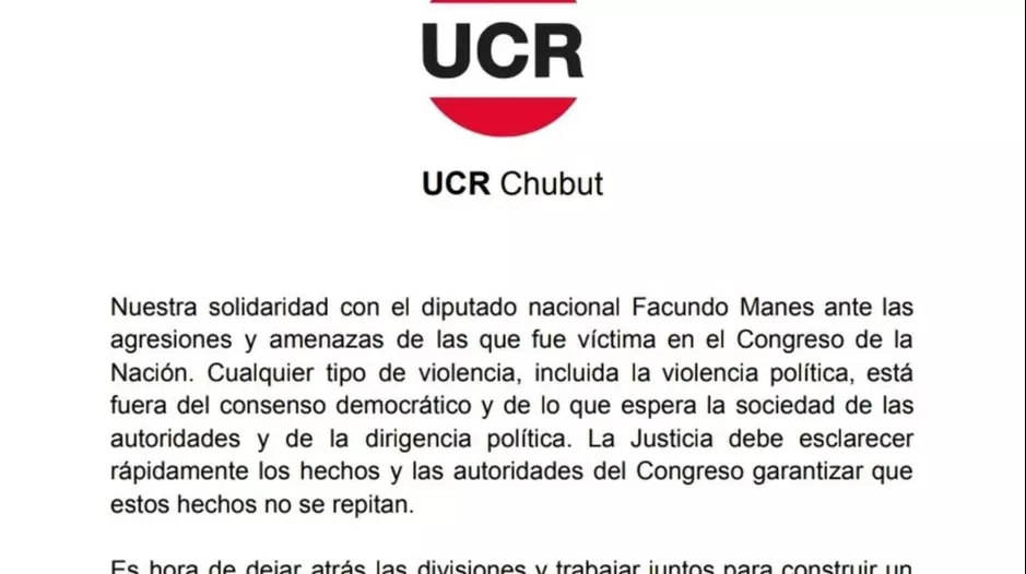 «Nuestra solidaridad con el diputado nacional Facundo Manes ante las agresiones y amenazas de las que fue víctima en el Congreso de la Nación. Cualquier tipo de violencia, incluida la violencia política, está fuera del consenso democrático y de lo que espera la sociedad de las autoridades y de la dirigencia política. La Justicia debe esclarecer rápidamente los hechos y las autoridades del Congreso garantizar que estos hechos no se repitan», expresa el comunicado que difundieron a través de sus redes sociales.