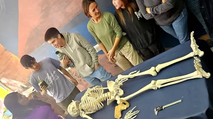 Luego, Gabriela Millán del Instituto de Diversidad y Evolución Austral (IDEAus), Soledad Leonardi y Karen Castro, del Instituto de Biología de Organismos Marinos (IBIOMAR) y Victoria Rodríguez del Instituto Patagónico para el Estudio de los Ecosistemas Continentales (IPEEC) trabajaron con los y las estudiantes sobre el rol de la arqueología forense en la identificación de los restos de personas desaparecidas.
