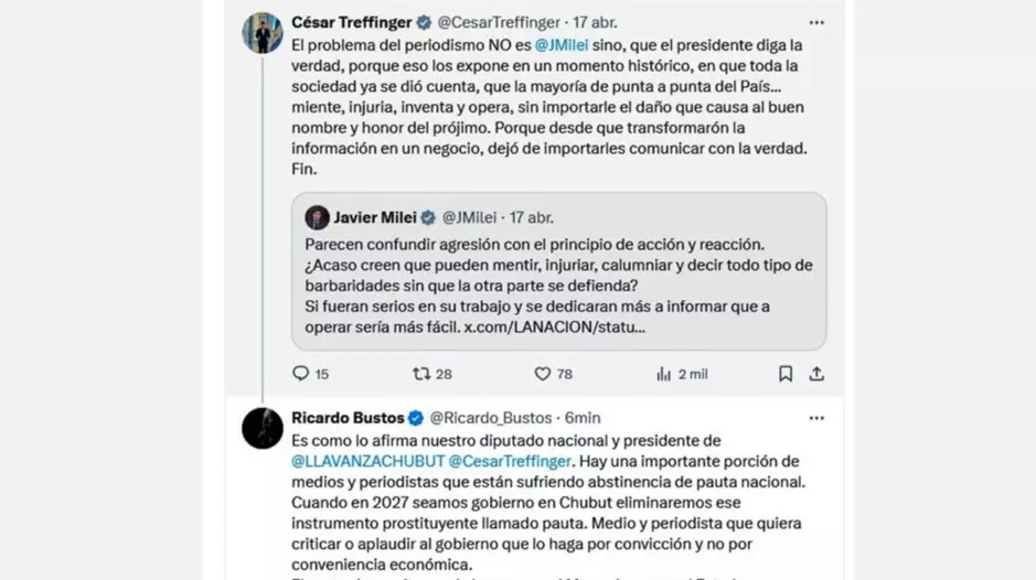 En ese marco, Bustos contestó la publicación convalidando una afirmación de Treffinger, cuando sostuvo que el problema del periodismo «no es Milei», el problema «es que el presidente Javier Milei diga la verdad».