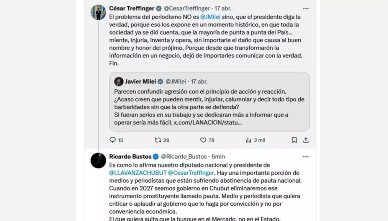 La afirmación tuvo inmediata repercusión y encontró eco en Bustos, quien respondió públicamente con un mensaje contundente: «Es así como vos lo afirmás». A partir de ahí, el precandidato intensificó sus críticas hacia lo que definió como «una importante porción de medios y periodistas que están sufriendo abstinencia de pauta nacional», en alusión a los recortes impulsados por el gobierno nacional en la asignación de fondos públicos a empresas periodísticas.