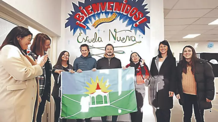 Durante la recorrida, Merino hizo entrega de una bandera de la ciudad, en el marco de una política institucional que contempla a todos los establecimientos educativos, tanto públicos como privados.