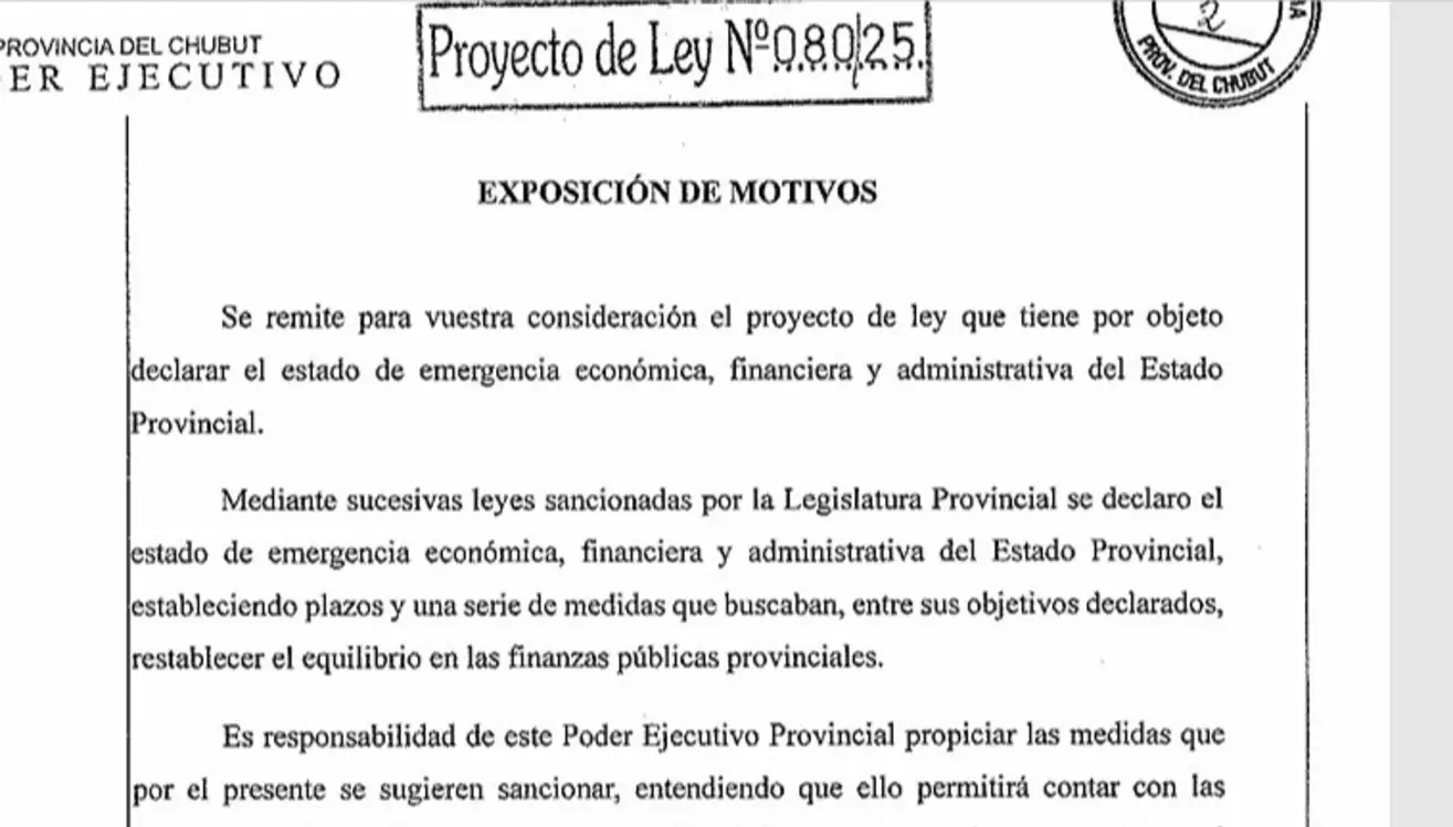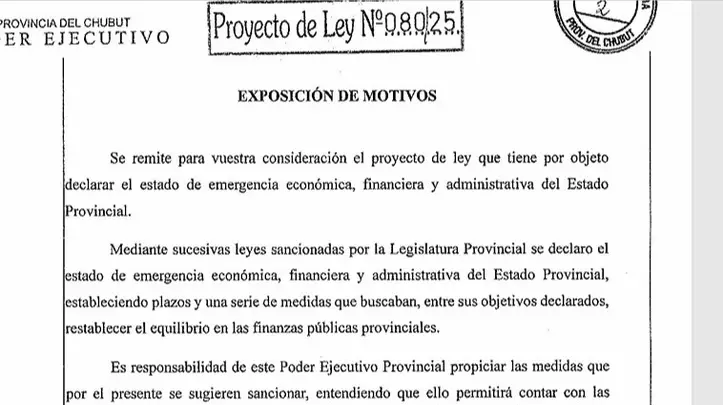 El gobernador Ignacio Torres envió al parlamento provincial un proyecto de ley que prorroga la emergencia económica por 18 meses. La norma, que entró en vigencia en la gestión anterior, suspende las ejecuciones de las sentencias, acuerdos conciliatorios y laudos arbitrales contra el estado provincial.