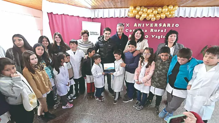 Durante la conmemoración por el 20º aniversario de la comuna, el titular del Ejecutivo chubutense realizó también la entrega de un Aula Digital Móvil y kits tecnológicos a la Escuela Nro 97 «Albertano Lucio Castro» como parte del Programa de Fortalecimiento Tecnológico a Instituciones Educativas.